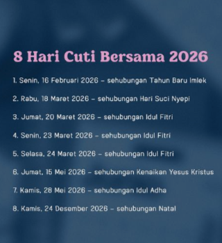 Informasi Jadwal Cuti Bersama Lebaran 2026 Resmi Pemerintah 17 Maret 2026 • 3 Dilihat • Pada tahun 2026, jadwal cuti bersama Idulfitri jatuh pada bulan Maret. Ketentuan ini telah ditetapkan...