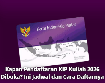 KIP Kuliah Kapan Pendaftaran KIP Kuliah 2026 Dibuka? Ini Jadwal dan Cara Daftarnya 27 Maret 2026 • Melanjutkan pendidikan ke perguruan tinggi merupakan cita-cita banyak pelajar di Indonesia. Namun, tidak sedikit calon...