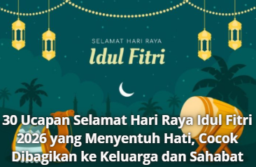 Informasi 30 Ucapan Selamat Hari Raya Idul Fitri 2026 yang Menyentuh Hati, Cocok Dibagikan ke Keluarga dan Sahabat 20 Maret 2026 • 3 Dilihat • Hari Raya Idul Fitri merupakan momen istimewa bagi umat Islam di seluruh dunia. Setelah menjalani...