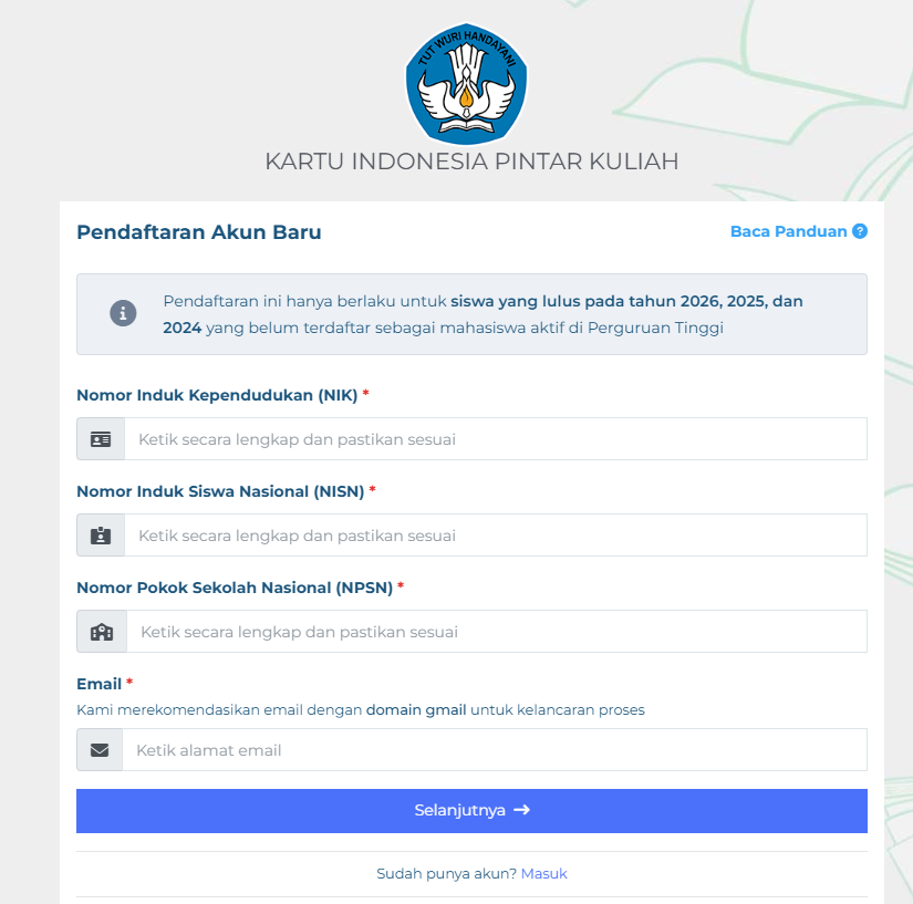 Pendaftaran KIP Kuliah dilakukan secara daring melalui laman resmi pemerintah. Berikut langkah-langkahnya:
