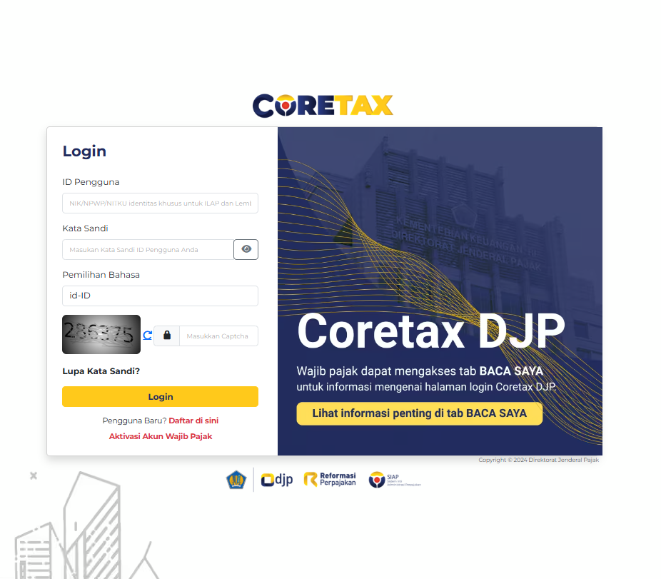 - Kunjungi situs resmi Coretax melalui https://coretaxdjp.pajak.go.id/.