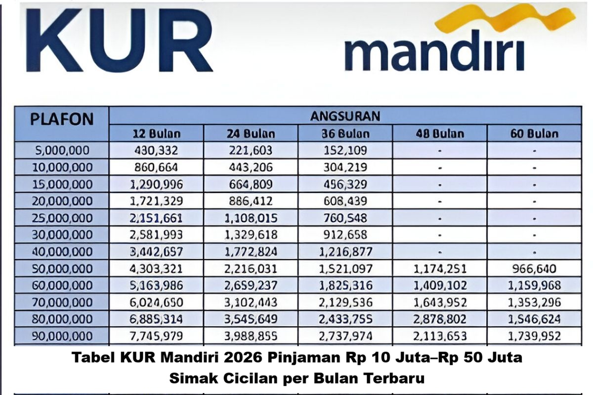 Tabel KUR Mandiri 2026 Pinjaman Rp 10 Juta–Rp 50 Juta